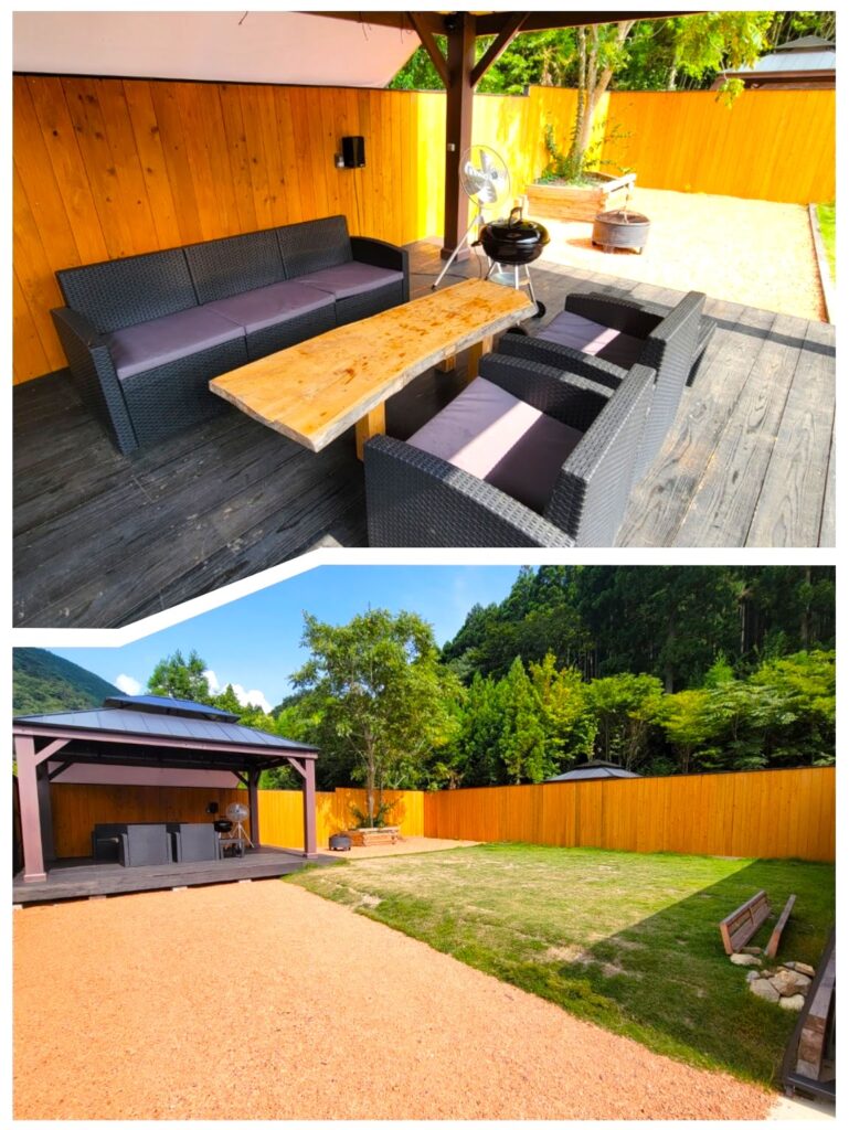 4m×4.5mガゼボ・ウッドデッキ・屋外用ソファー・テーブル・weberグリル(炭用)・焚火台 - 最大5名~7名まで