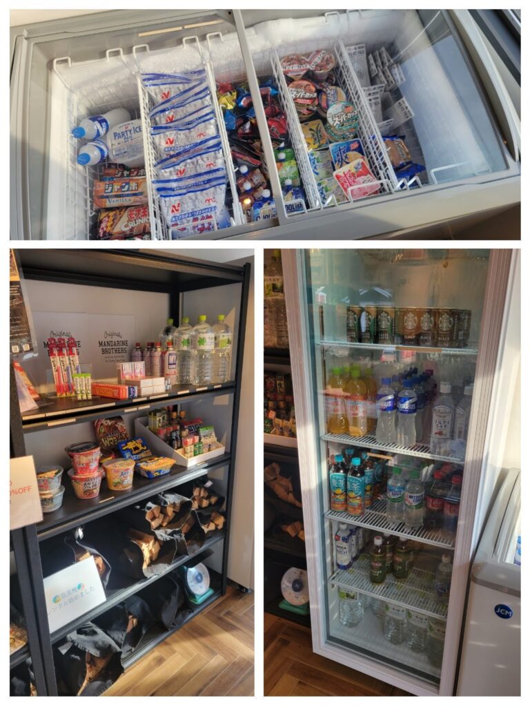 管理棟の売店では、ペット用品だけでなく、カップラーメンや調味料、ガス缶、ソフトドリンク、アイスクリームなどキャンプに必要なアイテムも揃っています。※アルコール類はありません。