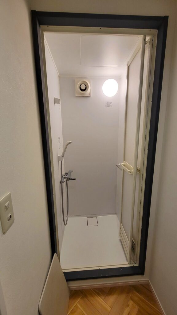 シャワールームはトイレの奥に1か所設置されており、無料でいつでも利用可能です。