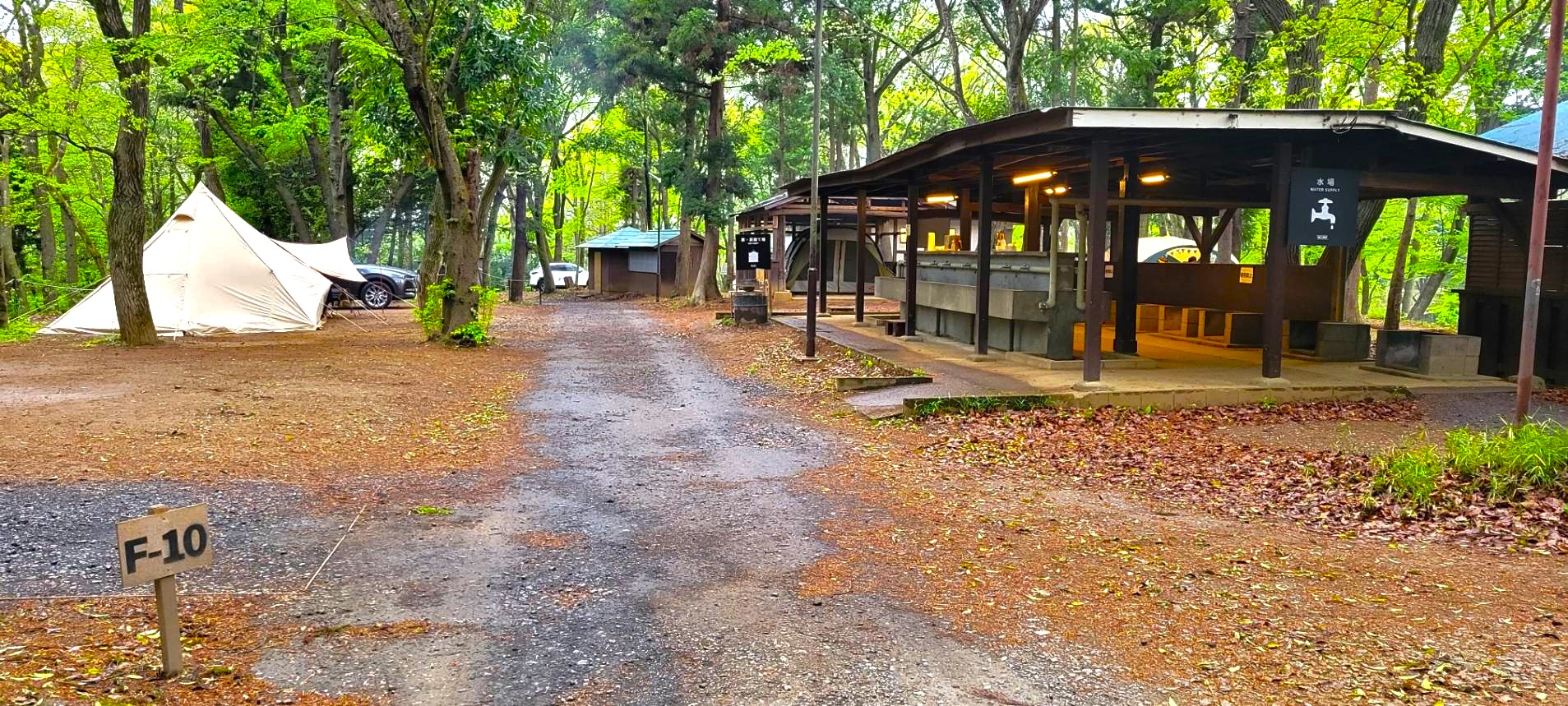 フォレストエリアは、60㎡〜90㎡の林間サイトが並ぶ人気エリアです。木々の木陰で涼しく過ごせ、屋根付きサイトもあるため天候を気にせずキャンプが楽しめます。炊事場も1カ所完備されており、快適にアウトドアを満喫できます。