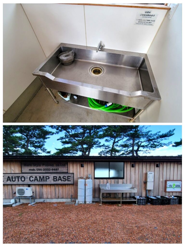 炊事場は建物内に1口、裏側に2口設置されています。お湯は出ませんが、生ごみ用コーナーもあり便利です。さらに建物内には夜間センサーライトが付いているため、夜でも安心して利用できます。