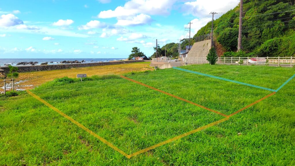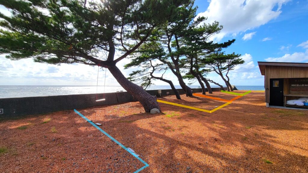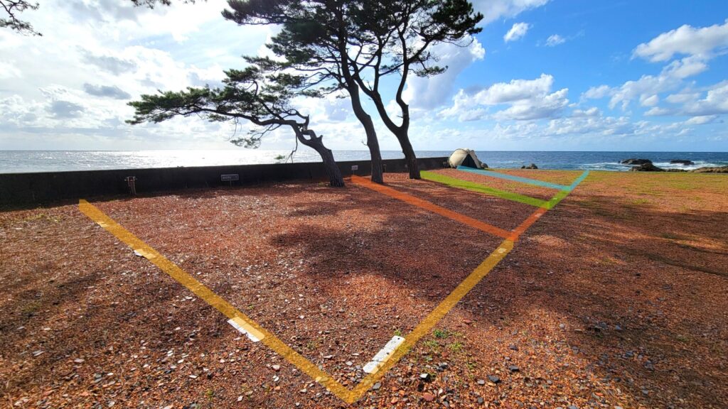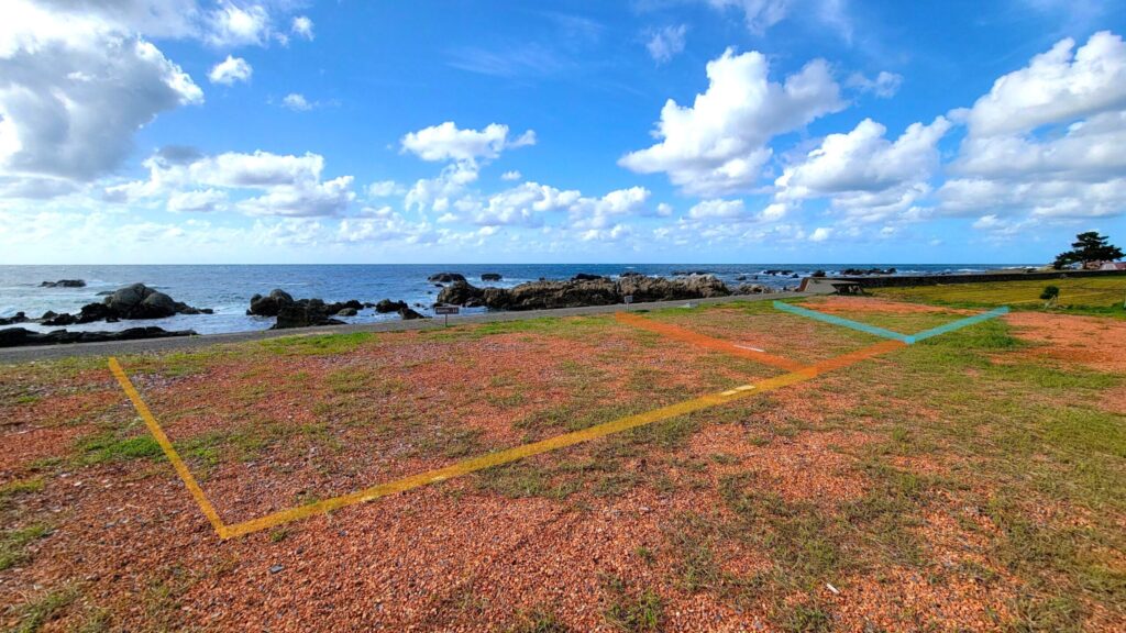 サイトマップの【BOOTH-11~13】は、堤防がない海沿いの区画で、遮るものなく日本海が見える眺望の良いサイトです。公式表記では8m×8mですが、実際の広さよりもゆったりと感じられます。こちらはすべて電源なしの区画です。