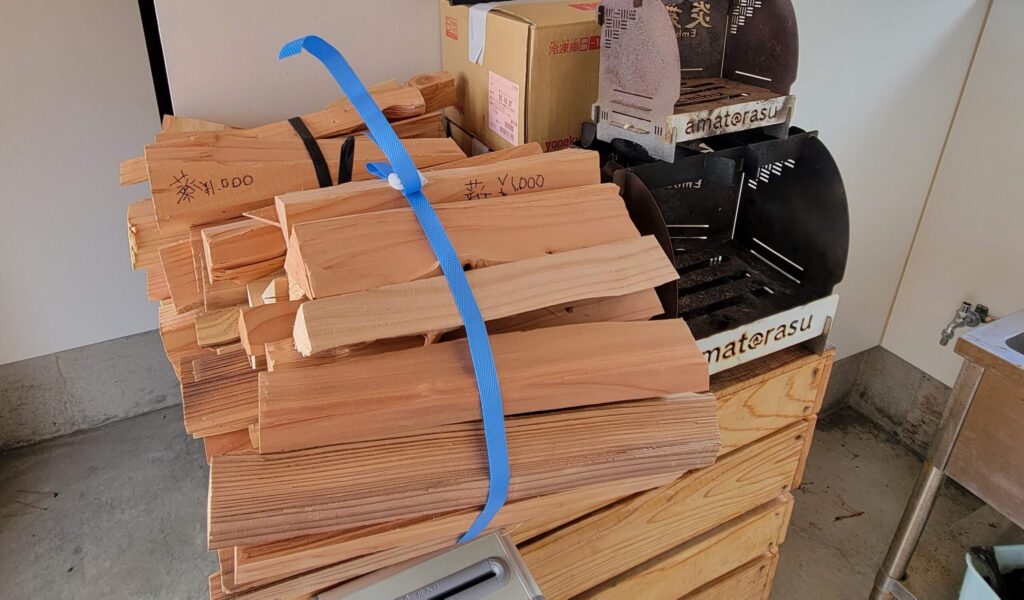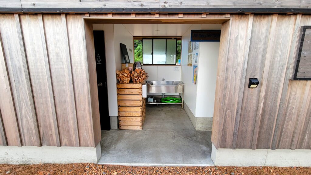 この建物の中に炊事場とトイレ、シャワールームがあり、売店はありませんが薪のみ販売しています。