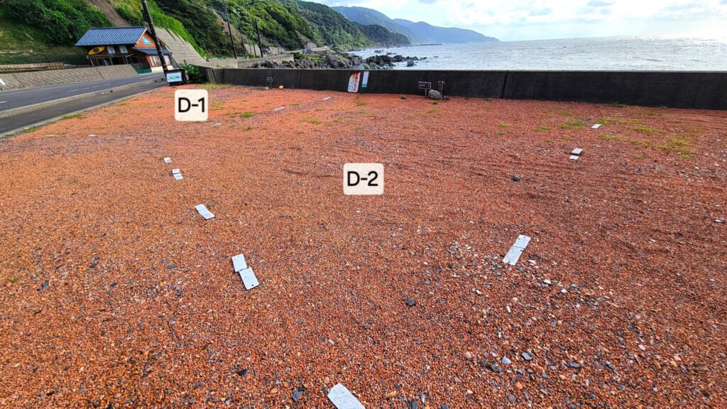 - D-1:広さ10m×14m、キャンプ場出入口にあり炊事場まで徒歩20秒、海へ降りる階段あり