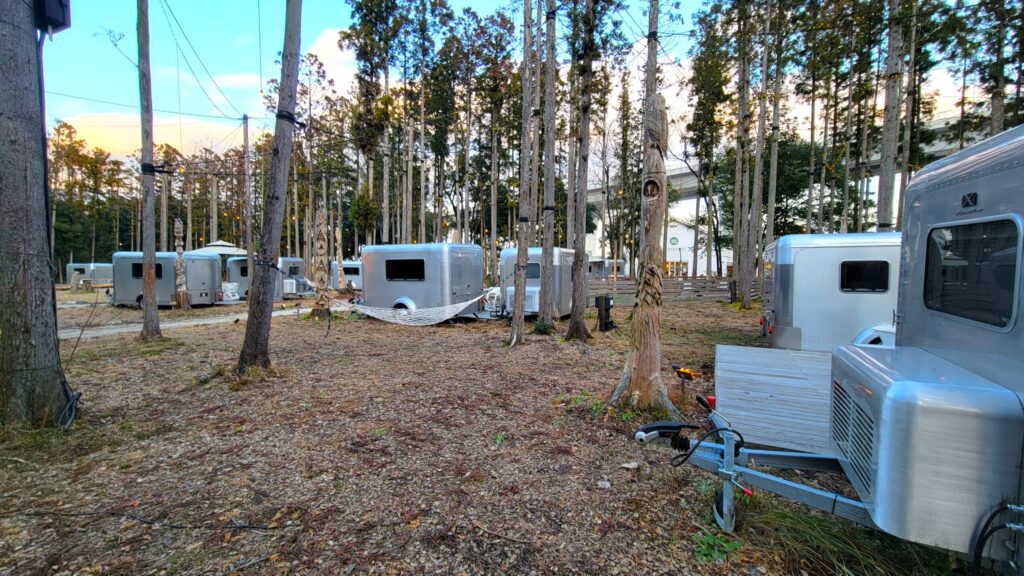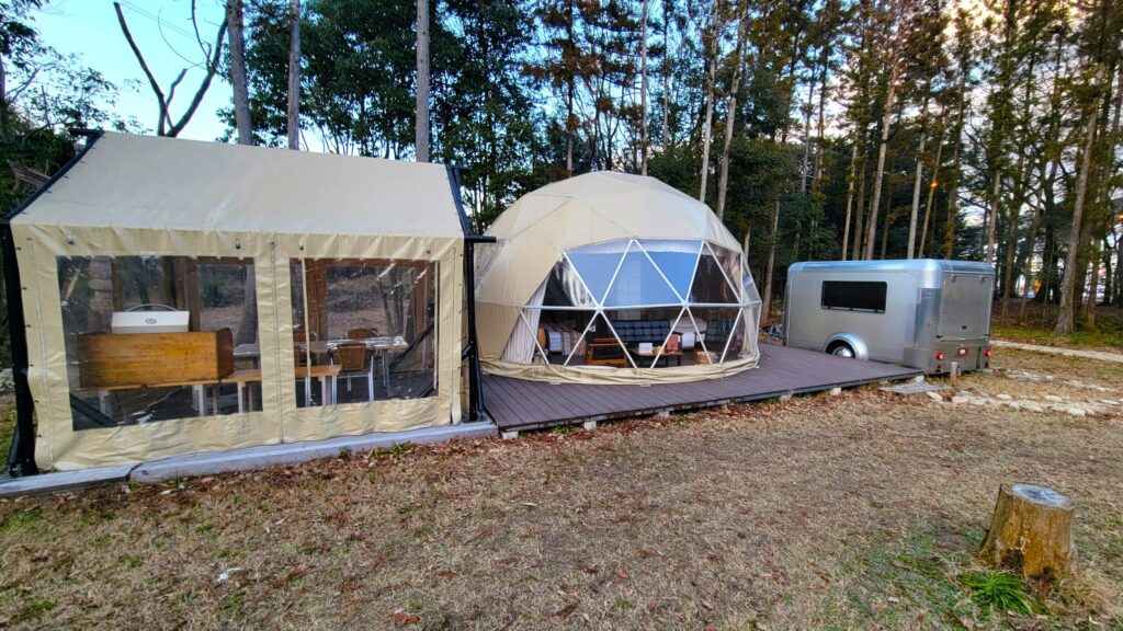 センターハウス北側の森林エリアには、トレーラーハウスやドームテントを備えたグランピング施設があります。