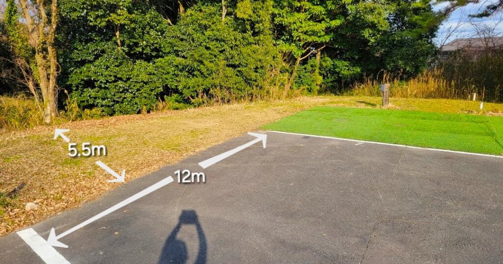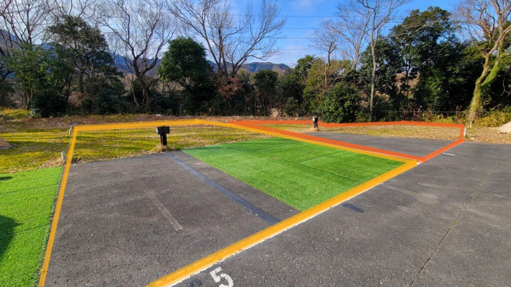 No.3は、人工芝とアスファルトに加え、後方に芝生スペースを備えた約150㎡のサイトとなっています。