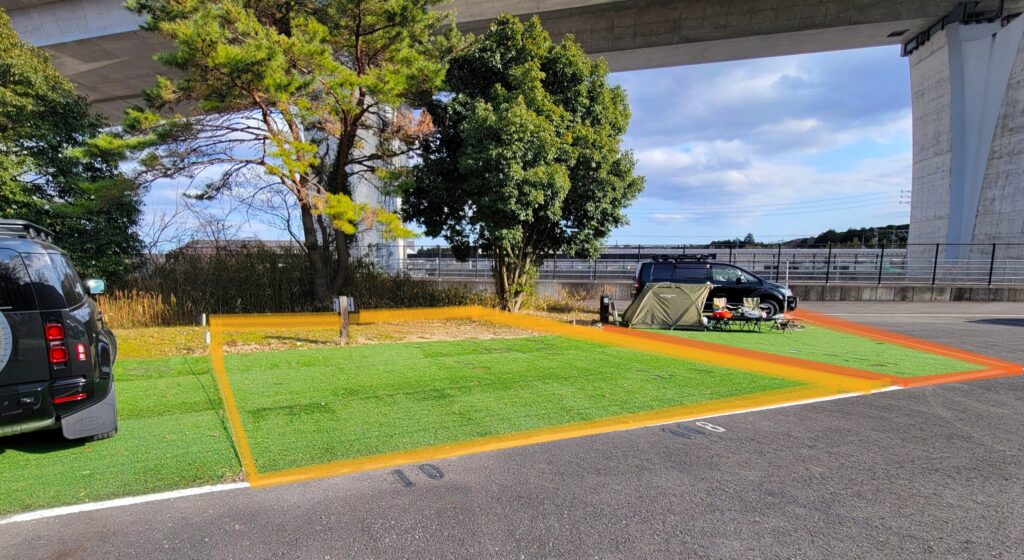 RVサイトは敷地内のいちばん奥に位置するサイトです。人工芝とアスファルトの駐車スペースがあり、全9区画にAC電源完備。区画によっては芝生スペースがあり、テントを設営することも可能です。