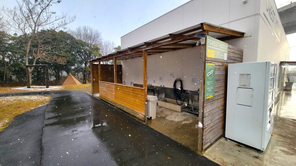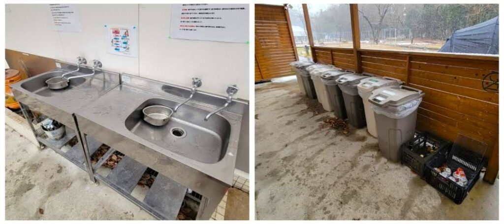 蛇口は6口あり、お湯も出るため、冬場でも快適に利用できます。また、焚き火台専用の洗い場とゴミステーションがあり、ゴミ袋の指定はなく、無料で処分可能です。