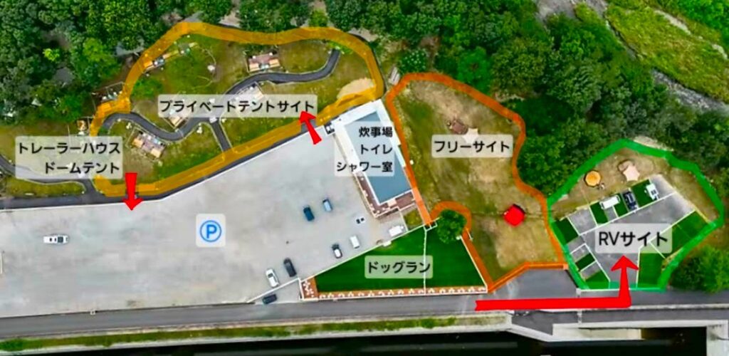 キャンプ場は、駐車場の北側にドームテントなどのグランピング施設と、【プライベートテントサイト(区画サイト)】が配置されています。プライベートテントサイトは、車の乗り入れ不可なので、マップ上の矢印で示した2か所から荷物を搬入します。フリーサイトも同様で、ドッグランの横からも荷物を搬入出来ます。(徒歩で20~30秒)