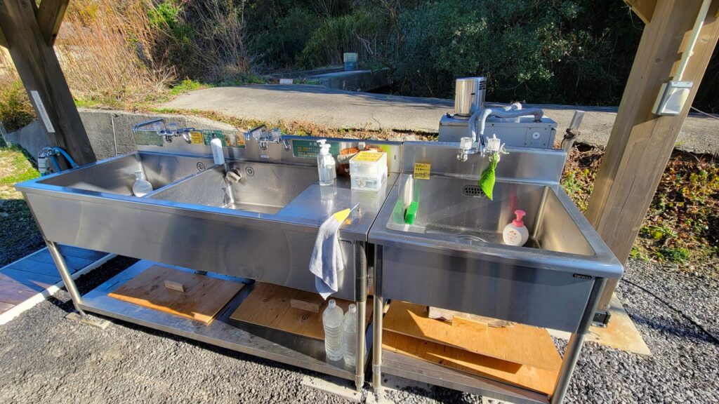 炊事場は、管理棟横にあり、炊事場は3口、お湯も使えて洗剤、スポンジ、生ごみ用網も設置してくれています。