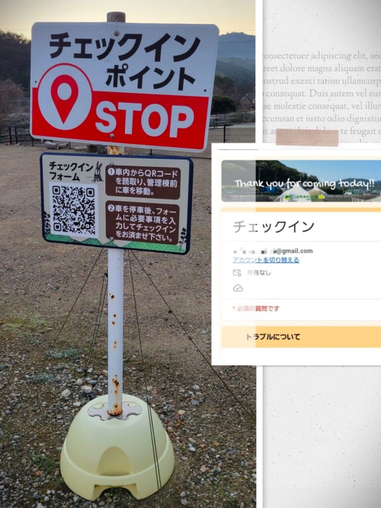 場内奥のチェックインポイントでQRコードを読み取り、利用案内のチェック項目を確認します。その後、管理棟でサイトの場所を案内してもらいます。