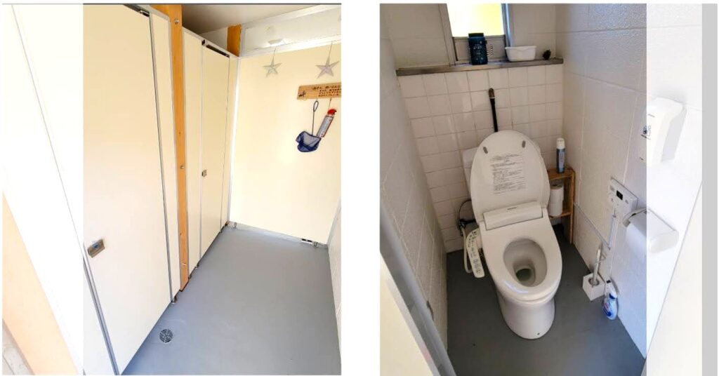 トイレとシャワールームは、管理棟のさらに奥側にあります。