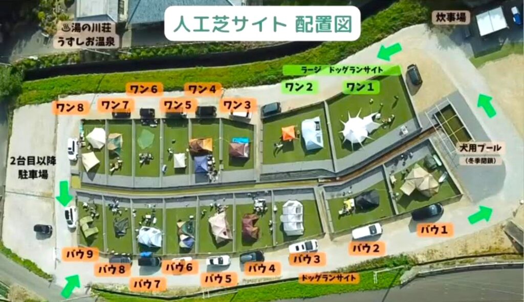 すべての区画は高さ約90cmの柵付きサイトで、地面には人工芝を全面敷設。ペット連れでも安心して利用でき、全区画にAC電源を完備しています。