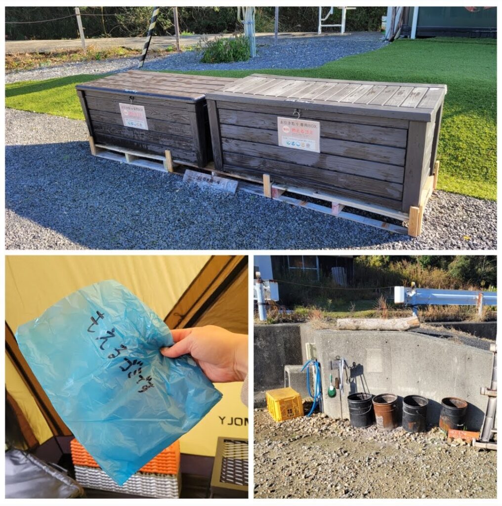 ゴミステーションは管理棟前にあり、ゴミ袋は「なっぷ」のオプションで事前選択でき、当日受付で購入することもできます。約30リットル・550円で、ペットボトルは一緒に捨てられます。