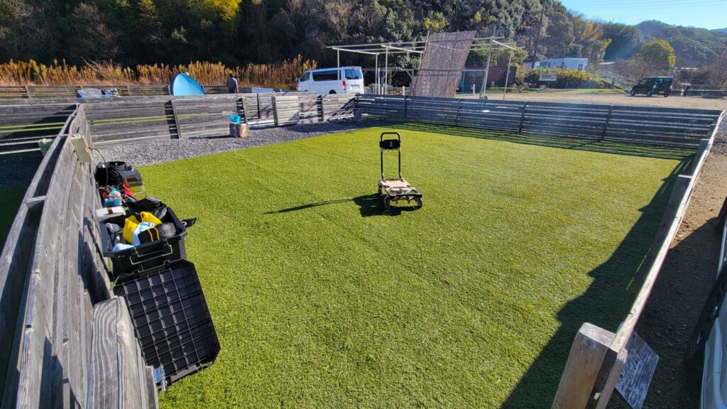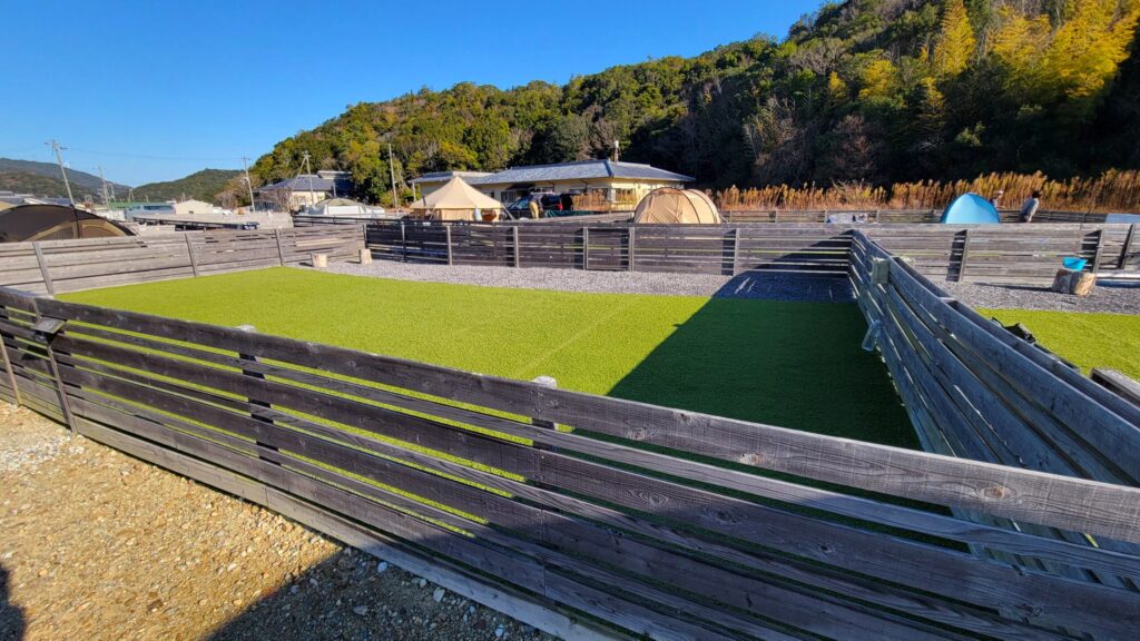 区画は大型犬でもノーリードで安心して遊ばせることができますし、人工芝なので足元やキャンプ道具が汚れにくく、フラットで安全な環境も魅力。