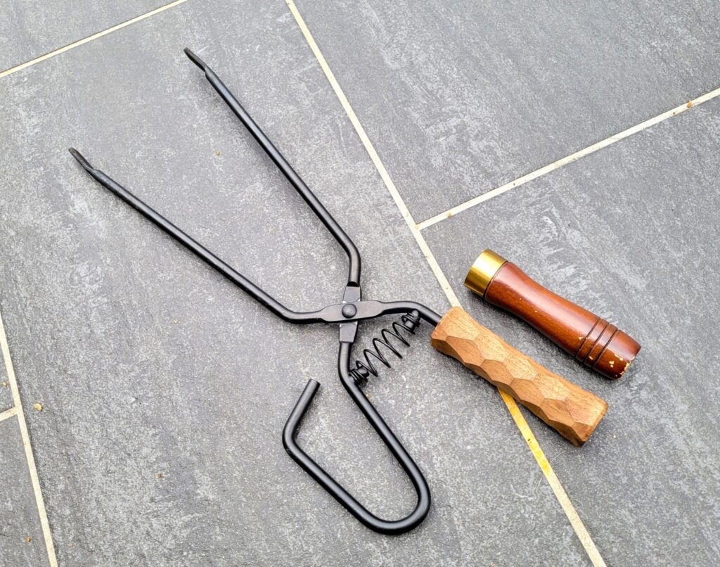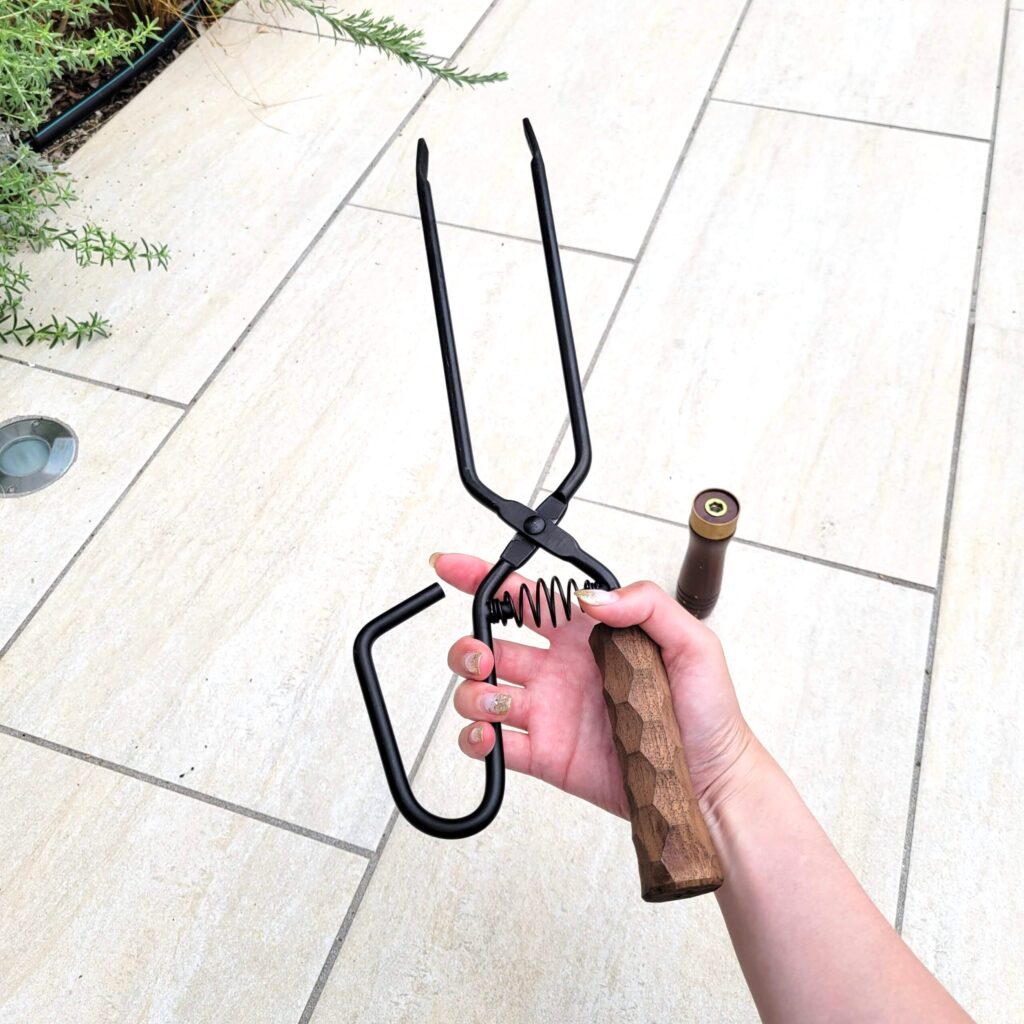 先端はスチール素材で、細かいものを掴みやすい角度と、高級木材の欅(けやき)と真鍮を組み合わせたグリップ。バネによって自然に開き、グローブをはめても握りやすく、太い薪もしっかり掴めるとっても使いやすいトングです。