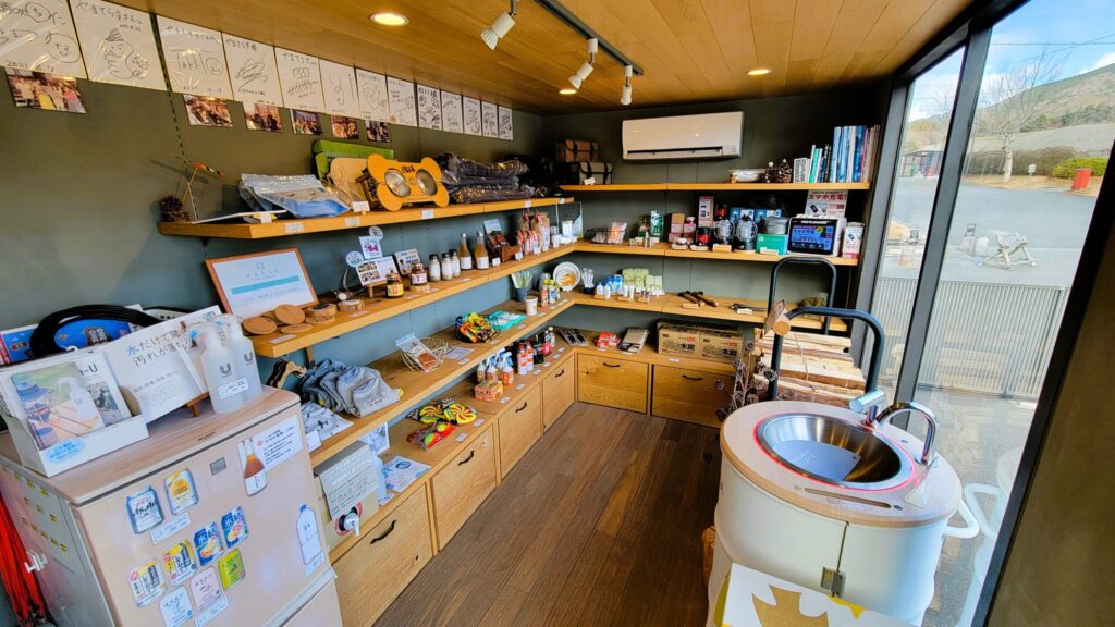 管理棟内は、薪やガス缶などのキャンプで使う日用品の他、お酒類や、ソフトドリンク、調味料やお菓子なども販売しています。