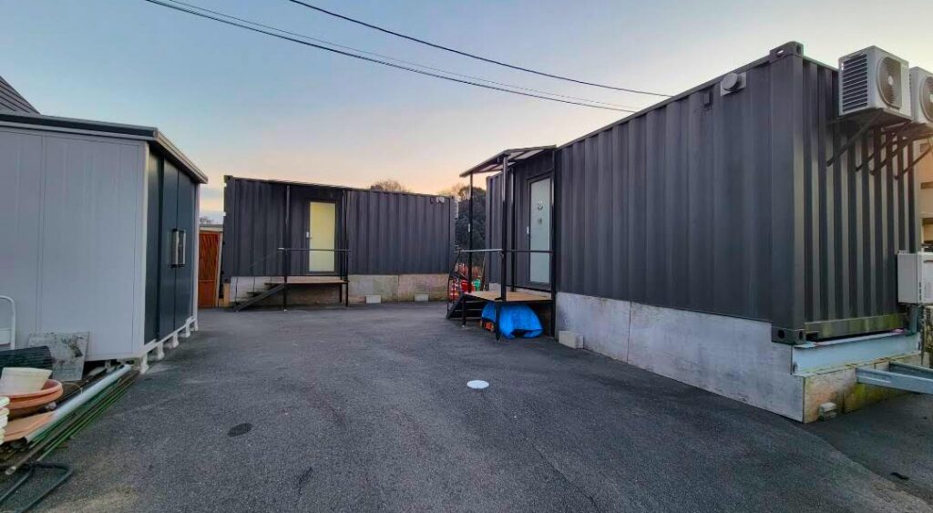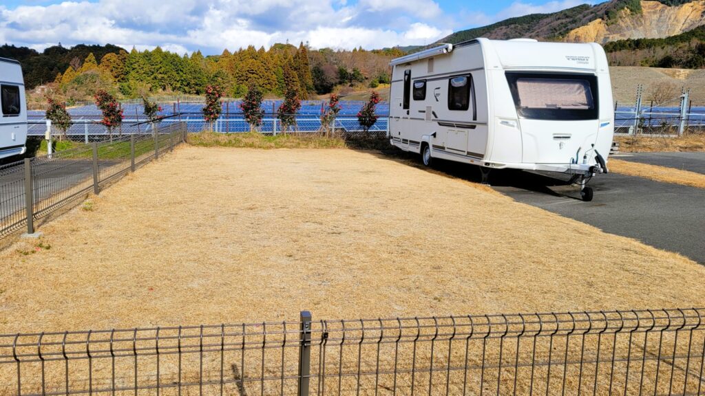 災害対策用のトレーラーハウスが設置されている縦長のオートサイトです。
