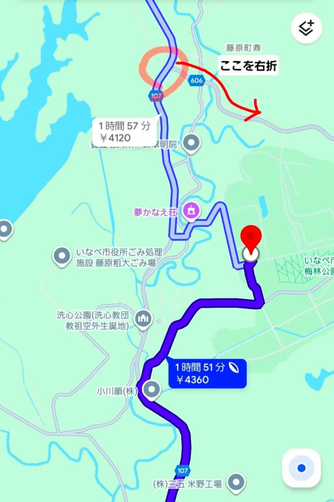 カーナビやGoogleマップなどの地図アプリを使用すると、画像のルートが表示されますが、道幅が狭く対向がしにくいため、キャンプ場へは、県道107号を県道606号まで北上し、県道606号を右折するルート(赤丸の交差点を右折)で来場するようにキャンプ場側が推奨しています。