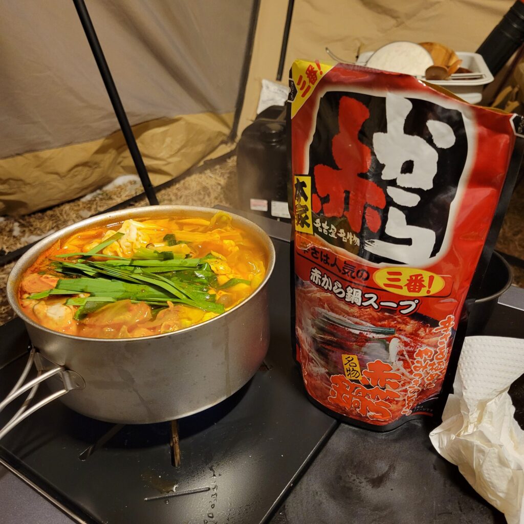冬はやっぱりお鍋の季節!市販の鍋つゆに、好きな具材を入れて煮込むだけで、体もぽかぽか温まる冬キャンプにぴったりの簡単キャンプ飯が出来上がります。
