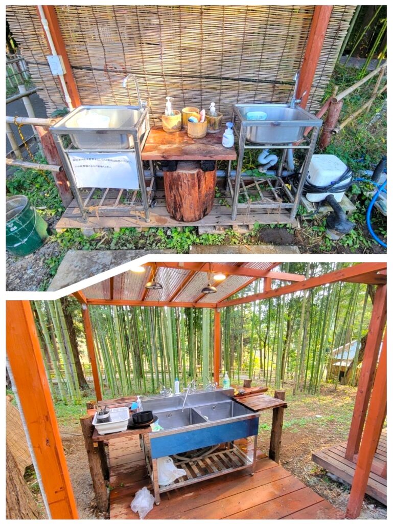 各炊事場には 洗剤、スポンジ、三角コーナー が備え付けられており、屋根付き炊事場からはお湯が出るので、快適に利用可能です。