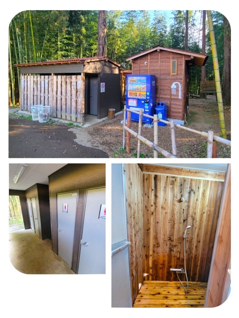 トイレは 男女各2か所 で、新品できれいに保たれています。シャワールームは、いつでも利用可能ですが、1回15分程度を目安に譲り合いながら使います。写真には写っていませんが、シャンプーやリンスも複数種類用意されており、キャンプ場で快適に利用できます。