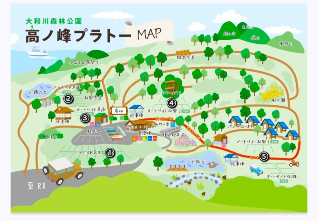 敷地の中央に管理棟や共用施設があり、キャンプサイトは管理棟を中心に 西側に3エリア・北側に1か所・東側の奥に1か所 点在していて、その他は散策やハイキングに適した遊歩道になっています。