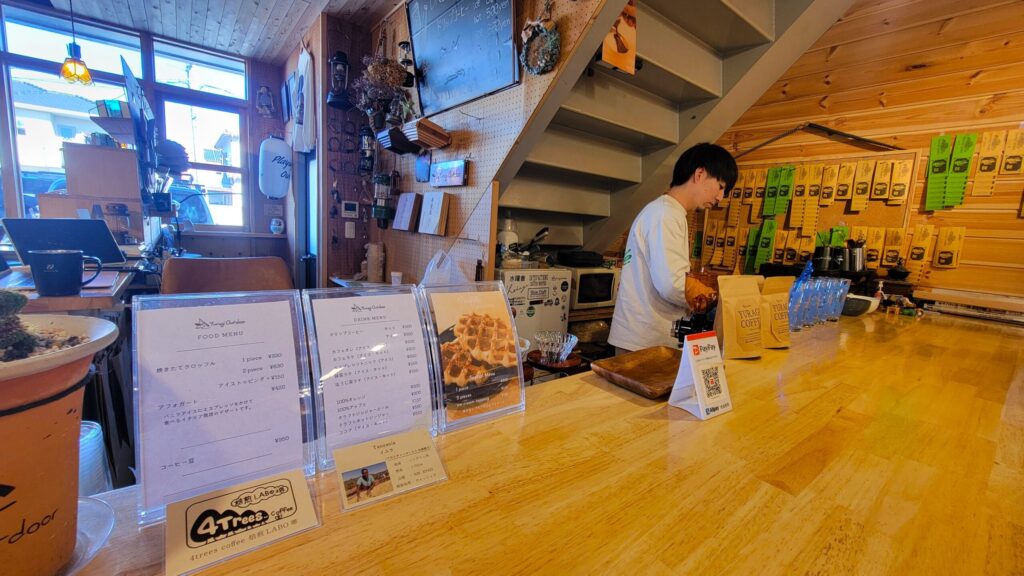 店内にはカフェスペースがあり、コーヒーやラテ系、ソフトドリンクを味わえます。コーヒーは、近隣のコーヒー専門店「4trees coffee 焙煎LABO堺」の豆を使用しており、注文後に豆を挽くため、香り高い淹れたての一杯を楽しめます。