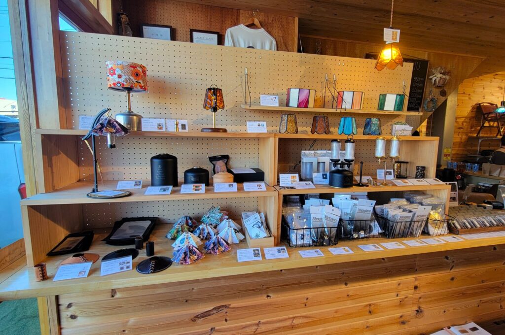 店内に入って右側の棚には、オイルランタンやミニライトなどの“灯り系ギア”をはじめ、個性豊かな焚き火台やトングなどの焚き火アイテムがずらりと並びます。オイルランタンのカスタムパーツやホヤも取り扱っているため、自分好みにカスタムしたい人にもおすすめのコーナーです。