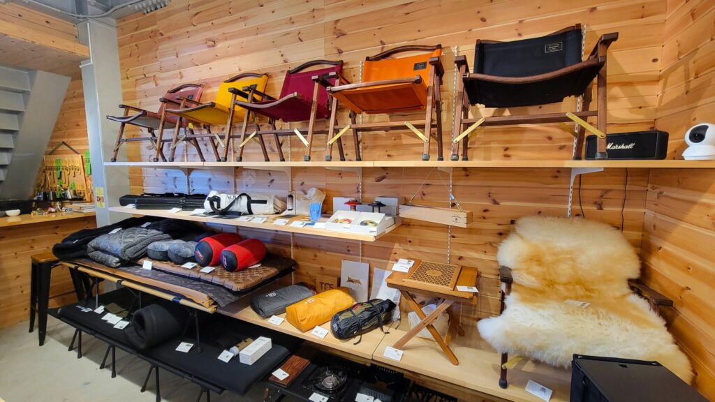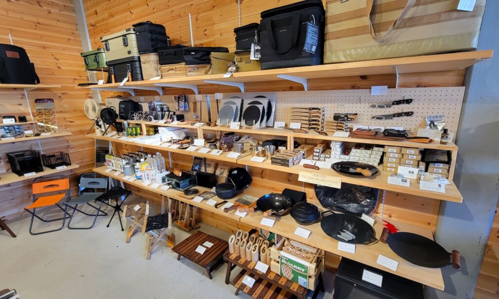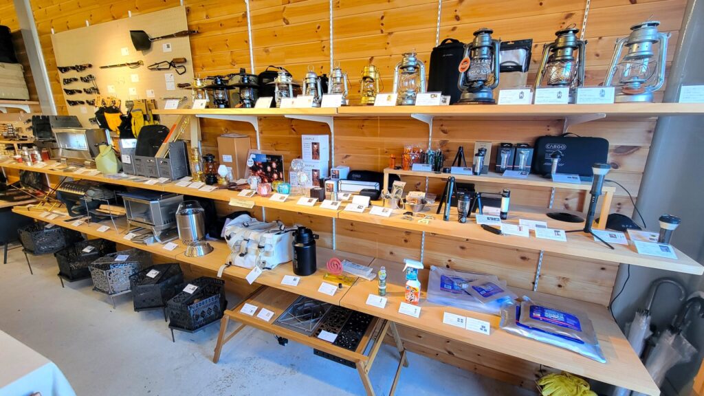 女性でも使いやすいおしゃれなガレージブランドが揃っており、キャンプギアはすっきりと見やすく陳列されているため、アウトドア初心者でも選びやすいのが魅力です。