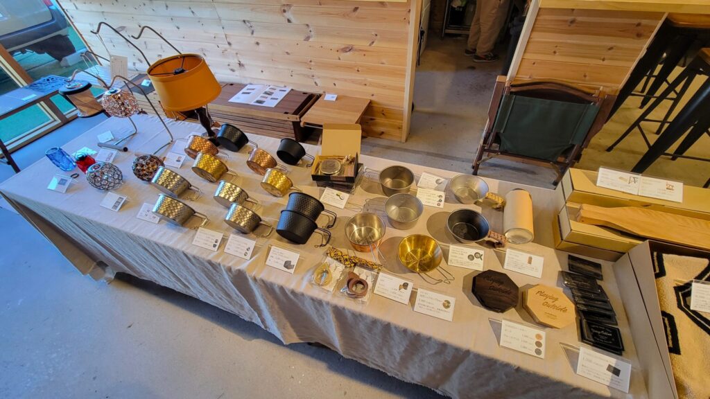 店内にはキャンプ用の調理器具コーナーもあり、JHQのマルチグリドルをはじめ、お鍋類、バーナー、ナイフやシェラカップなど実用的なクッキングギアを取り揃えています。