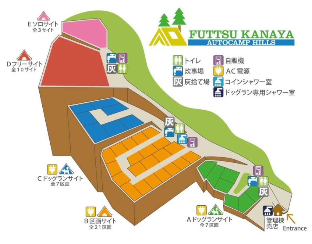 サイトは大きく5つのエリアに分かれていて、受付がある管理棟から1番奥のソロサイトまでサイトごとに高低差があります。