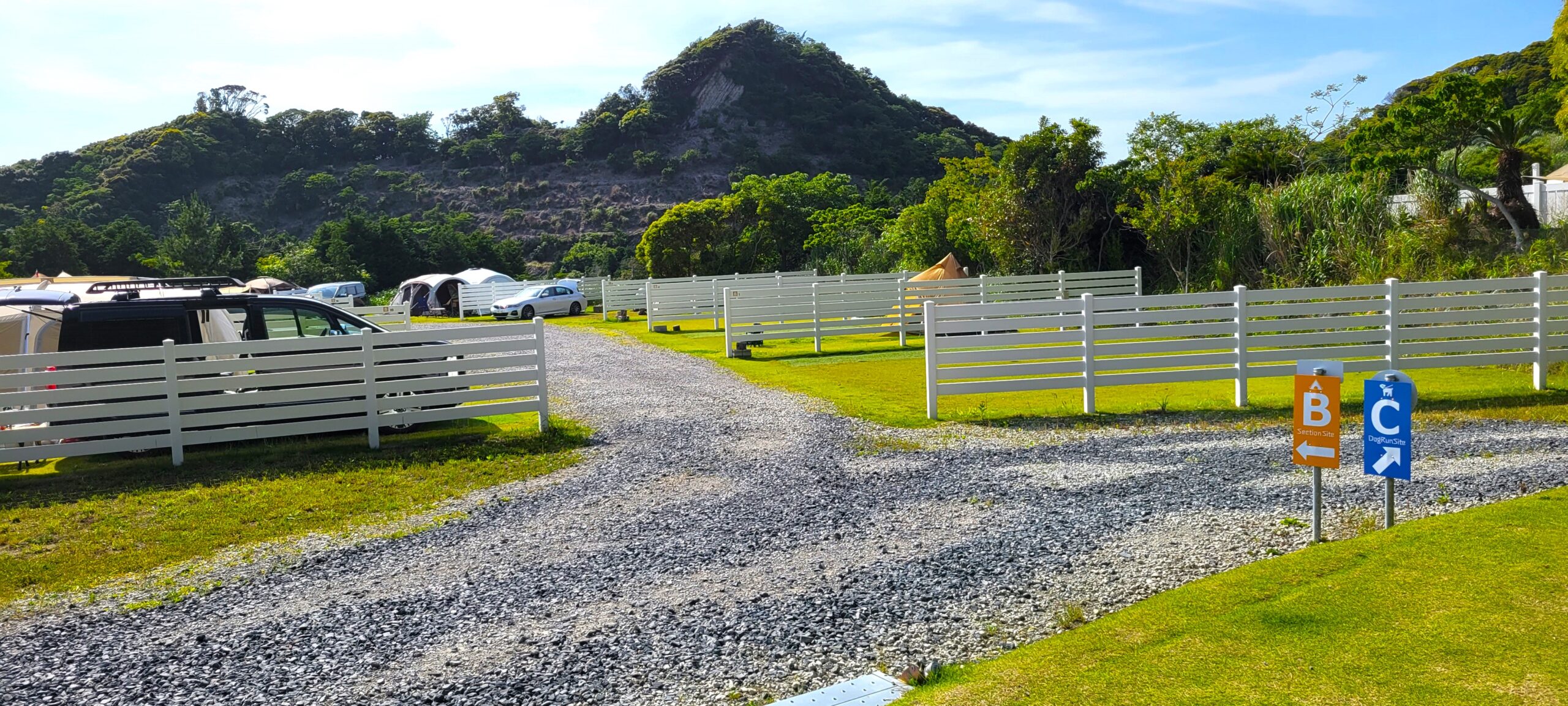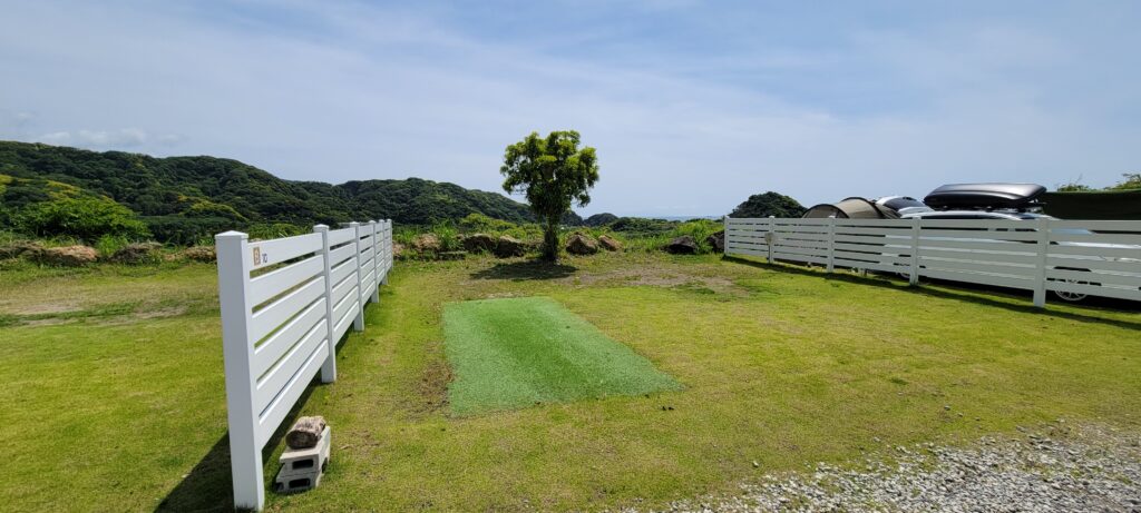 Aドッグランサイトは全部で7区画あり、広々としたフラット芝生の柵付サイトです!