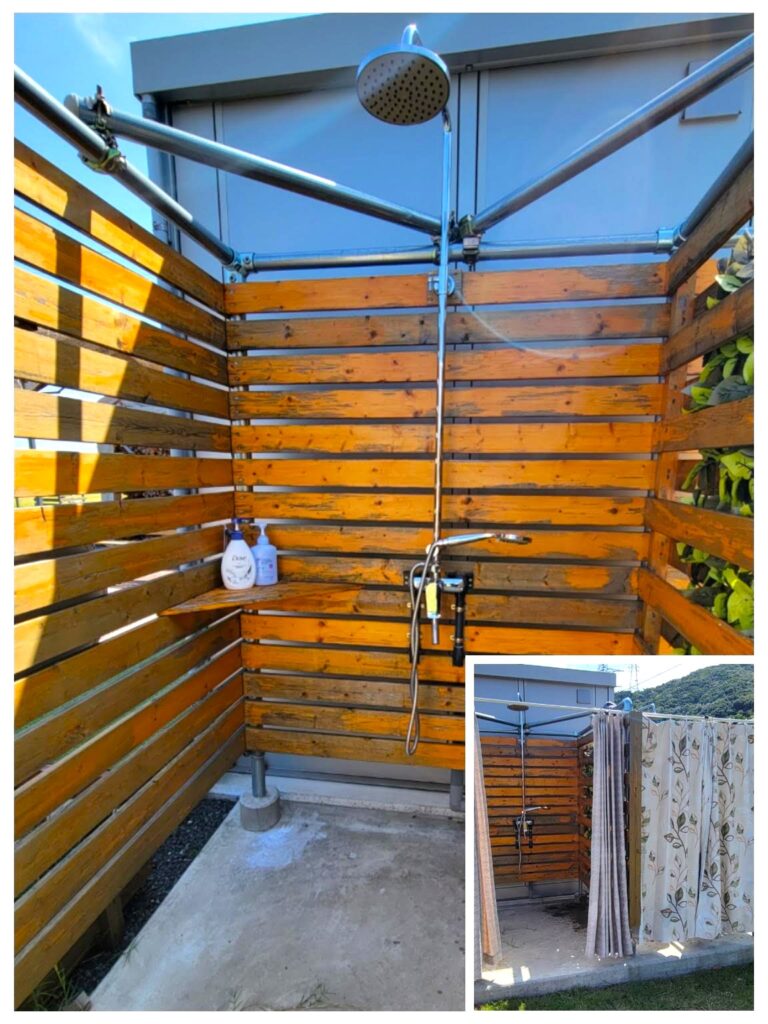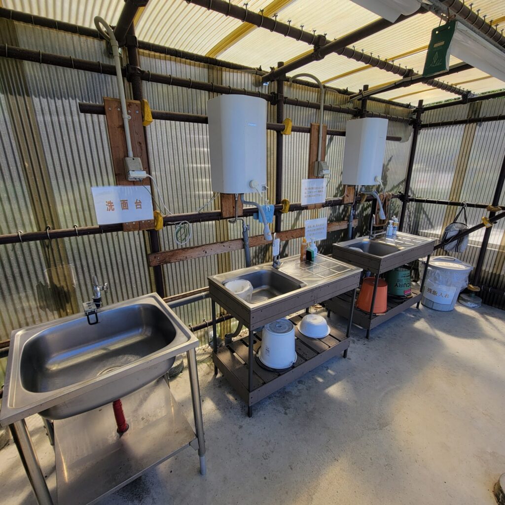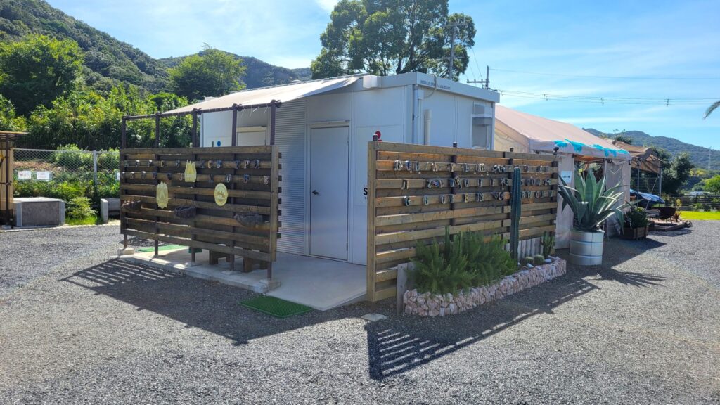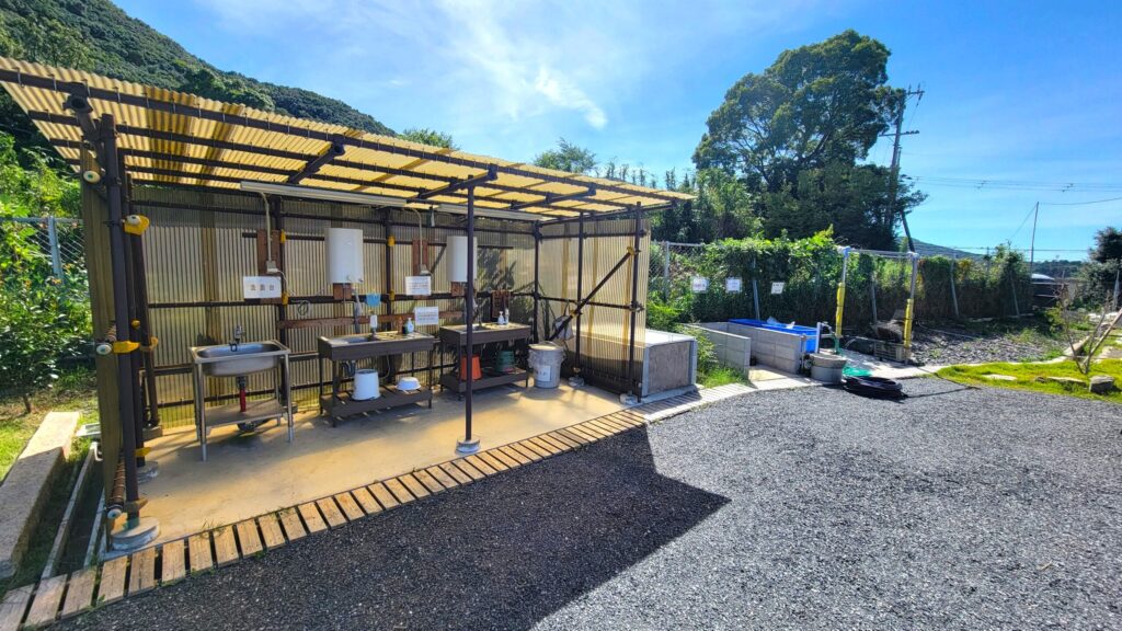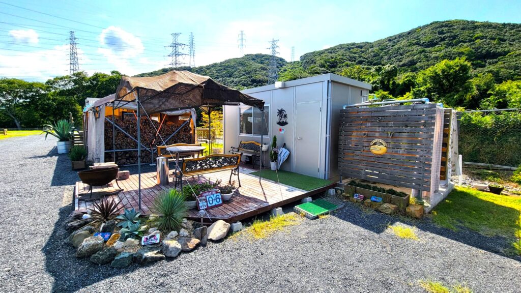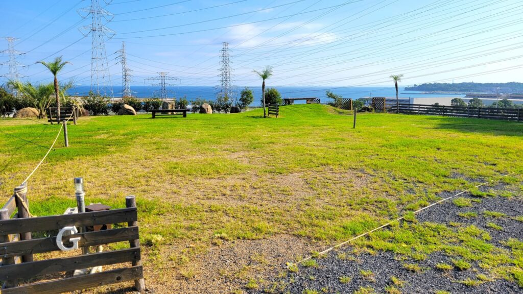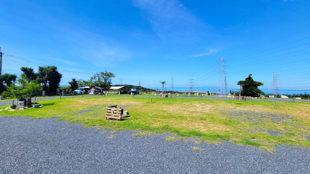 ここは、高台にある空き地だった場所を、整備して作られたキャンプ場で、広い区画サイトが12区画あり、海が望める高台の開放的な景色を見ながら、ゆったりと過ごせるのが魅力です。さらに全サイト電源付きで、どのサイトでもペットOK!大阪や和歌山市内からもアクセス良好で、快適にのんびりキャンプを楽しみたい方にもおすすめのキャンプ場です。