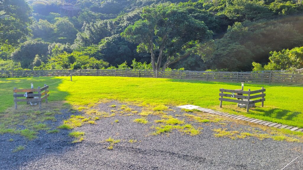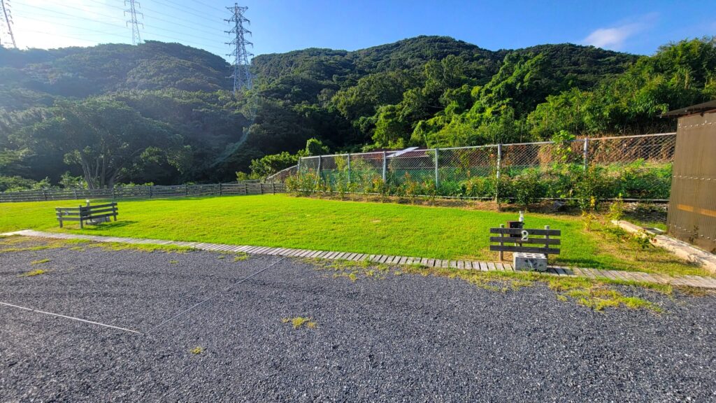 ここは、高台にある空き地だった場所を、整備して作られたキャンプ場で、広い区画サイトが12区画あり、海が望める高台の開放的な景色を見ながら、ゆったりと過ごせるのが魅力です。さらに全サイト電源付きで、どのサイトでもペットOK!大阪や和歌山市内からもアクセス良好で、快適にのんびりキャンプを楽しみたい方にもおすすめのキャンプ場です。