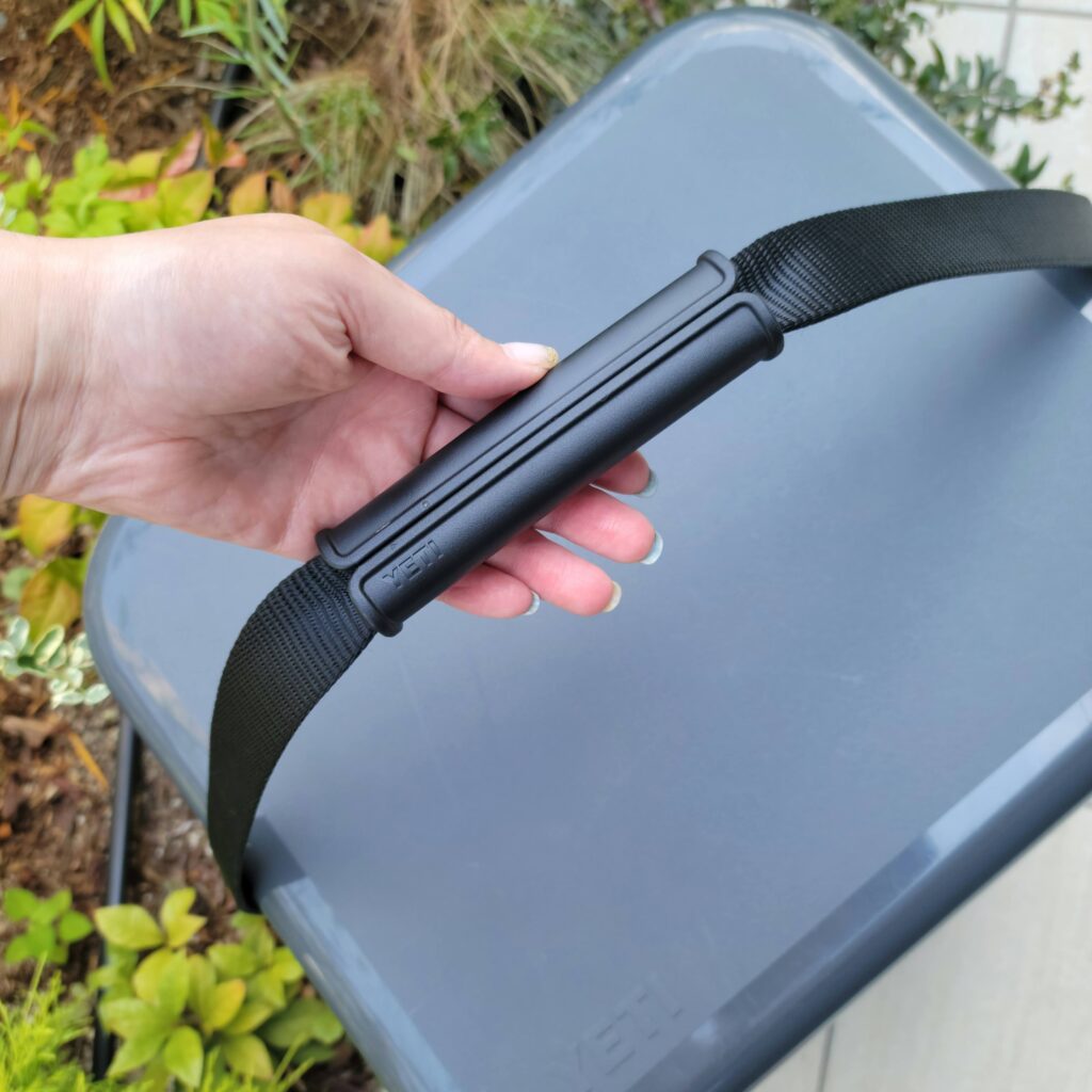 上部にしっかりとしたハードハンドルが付いていて、グリップ付きの柔らかいラバー素材で、荷物を入れた状態でも片手で持ち運びが可能な構造です。